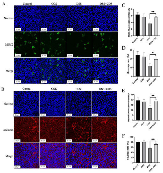 Effect of COS (chitosan oligosaccharide) on the expression of MUC2 and occludin in HT-29 and Caco-2 cells. (A) Immunofluorescence views of MUC2 (green) secreted by HT-29 cells in the control, COS, DSS (dextran sulfate sodium), and DSS + COS groups; (B) immunofluorescence views of occludin (red) secreted by Caco-2 cells in the control, COS, DSS, and DSS + COS groups; computerized quantification of the mean fluorescence intensity and the coverage rate of MUC2 (C,D) or occludin (E,F) was performed. The average value of randomly taken images was calculated (n = 9, * p < 0.05, ** p < 0.01). Error bar represents the standard deviation. Images represent the typical situation of three independent experiments. Scale bars, 25 µm.