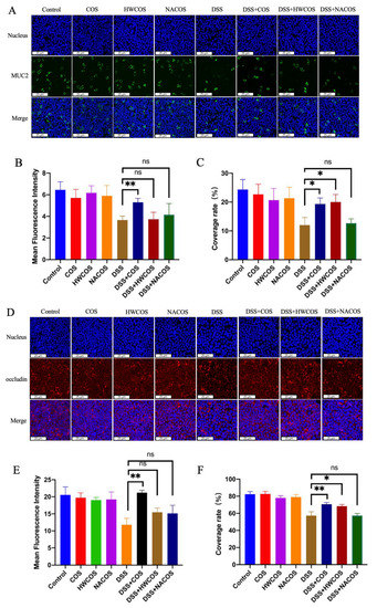 Effect of COS, HWCOS (high-molecular-weight chitosan oligosaccharide), and NACOS (chitin oligosaccharide) on the expression of MUC2 and occludin in HT-29 and Caco-2 cells. (A) Immunofluorescence views of MUC2 (green) secreted by HT-29 cells in the control, COS, HWCOS, NACOS, DSS, DSS + COS, DSS + HWCOS, and DSS + NACOS groups; (D) immunofluorescence views of occludin (red) secreted by Caco-2 cells in the control, COS, HWCOS, NACOS, DSS, DSS + COS, DSS + HWCOS, and DSS + NACOS groups; computerized quantification of the mean fluorescence intensity and the coverage rate of MUC2 (B,C) or occludin (E,F) was performed. The average value of randomly taken images were calculated (n = 9; * p < 0.05, ** p < 0.01). Error bar represents the standard deviation. Images represent the typical situation of three independent experiments. Scale bars, 25 μm.