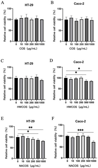 Cell viability after COS, HWCOS, and NACOS treatment in HT-29 and Caco-2 cells. Cells were treated with different concentrations (10, 100, 200, 500, 1000 μg/mL) of COS, HWCOS, and NACOS for 24 h. After 24 h of incubation, an 3-(4,5-dimethylthiazol-2-yl)-2,5-diphenyltetrazolium bromide (MTT) assay was performed to measure the HT-29 cell viability of COS (A), HWCOS (C), and NACOS (E), and the Caco-2 cell viability of COS (B), HWCOS (D), and NACOS (F). The average value of the data was calculated (n = 5; * p < 0.05, ** p < 0.01, *** p < 0.001). Error bar represents the standard deviation. Data represent the typical situation of three independent experiments.