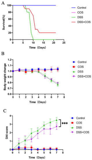 Treatment with COS improved clinical symptoms of DSS-induced colitis. Mice were given 4% (wt/vol) of DSS in drinking water for 7 consecutive days and intraperitoneally injected with COS at a dose of 200 mg/kg/day for 21 days at the same time. (A) Effect of treatment with COS on the survival rate of mice at 21 days. (B) Effect of treatment with COS on the body weight change of mice at 7 days. (C) Effect of treatment with COS on the DAI score of mice at 7 days. Results were presented as mean ± SD (n = 8; ns, not significant, *** p < 0.001).