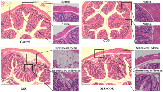 To further investigate the effect of COS on the intestinal barrier, H&E (hematoxylin and eosin) staining was performed to assess the histopathological alteration of the colon. As depicted in Figure 6, there was no significant histological change between the control and the COS-treated group. However, severed submucosal edema and the infiltration of inflammatory cells were observed in the DSS group (Figure 6, black frames). As expected, submucosal edema and the infiltration of inflammatory cells were alleviated by COS administration, which indicated that COS was effective in preventing severe intestinal damage in this model.