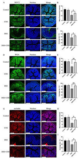 Treatment with COS restored the intestinal barrier damage of DSS-induced colitis. Immunofluorescence views of MUC2 (green) (A), FITC-WGA (green) (D), and occludin (red) (G) in intestinal tissue; computerized quantification of the mean fluorescence intensity and the coverage rate of MUC2 (B,C), FITC-WGA (E,F), and occludin (H,I) was performed. The average value of randomly taken images were calculated (n = 9; * p < 0.05, ** p < 0.01). Error bar represents the standard deviation. Images represent the typical situation of three independent experiments. Scale bars, 200 μm.