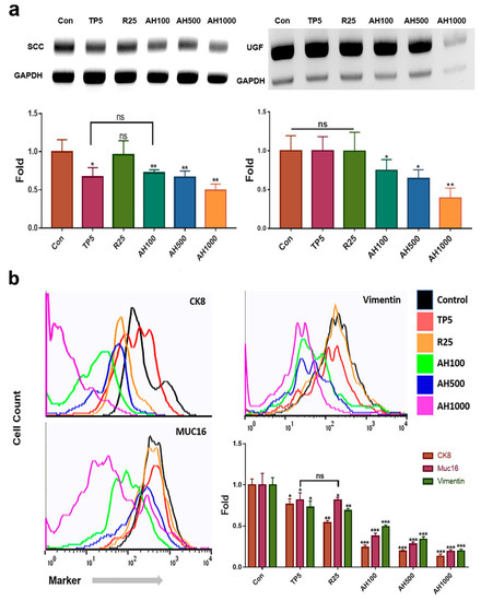 Levels of endometrial cancer (EC) cell markers in the presence of bioactive substances. (a) qPCR results indicate that the expression levels of markers of the endometrial cancer cells, such as squamous cell carcinoma antigen (SCC) and urinary gonadotropin fragment (UGF), exposed to bioactive substances, including 5 μg/mL tocopherol-α (TP5), 25 μg/mL rutin (R25), and 100, 500, and 1000 μg/mL A. helianthus extract (AH100, AH500, and AH1000, respectively), were downregulated. (b) CK8+, Muc16+ and Vimentin+ cells were counted using a flow cytometer. ns: not significant; * p < 0.05; ** p < 0.01; *** p < 0.001.