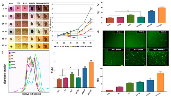 AH and TP5 significantly inhibited EC migration after 36 h, in contrast to the enhanced EC migration in the control (Figure 2a). EC migration inhibition in the presence of AH1000 was seven times higher than that in the control, while that in the presence of AH100 and AH500 was about two times higher than that in the presence of TP5. Likewise, vimentin expression and EC migration inhibition in the presence of R25 were not different from those in the control cells (Figure 1b and Figure 2a). Interestingly, only AH1000 strongly suppressed the EC cell invasive activity at 12 h, which was 1.56 times lower than that in the control cells (Figure 2b). These substances also affected mitochondrial membrane potential (MMP) and cellular senescence. TP5 did not affect MMP, although MMP in the presence of R25 was 1.5 times lower than that in the control, while that in the presence of AH500 and AH1000 was significantly lower than that in the presence of R25 (Figure 2c). The cancer cells were senescenced by all substances. Notably, the senescence by AH1000 was approximately 4.16 and 2.1 times higher than that by TP5 and R25, respectively (Figure 2d).