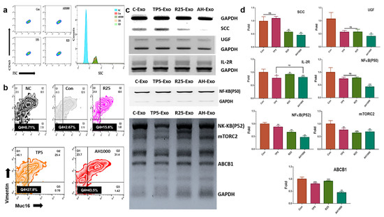 The induced CD63+-exosomes were isolated from EC cells in the presence of the three bioactive substances (Figure 3a). The EC cells were exposed to exosomes that downregulated the expression of markers, including SCC, UGF, and IL2-receptor (Figure 3b). Additionally, EIE downregulated the expression of drug resistance-associated genes, including NF-κB (P50, P52), mTORC2, and ABCB1 (Figure 3c). Furthermore, the EIE and TP downregulated Muc-16+vimentin+ cell count by 0.37 and 0.45 times, respectively (Figure 3d).