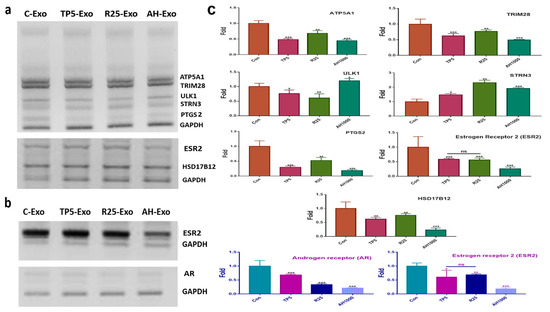 Effects of induced exosomes on various parameters associated with endometrial cancer (EC) cells; (a) Effects of miRNAs on biochemical marker levels. (b) Effects of miRNAs on ovarian cancer cells; 5 μg/mL tocopherol-α (TP5), 25 μg/mL rutin (R25), and 1000 μg/mL A. helianthus extract (AH1000). (c) Histograms for the a and b panels. C-Exo, exosomes from EC cells; TP5-Exo, exosomes from TP5-treated EC cells; R25-Exo, exosomes from R25-treated EC cells; AH-Exo, exosomes from AH1000-treated EC cells. ns: not significant; * p < 0.05; ** p < 0.01; *** p < 0.001.