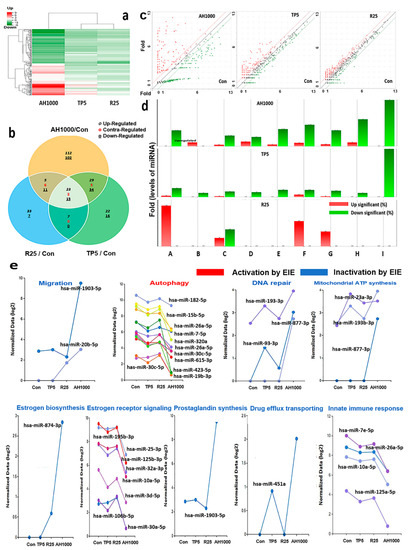 The clustering heatmap displayed the patterns of significantly altered miRNAs based on the analytical results for miRNAs in the exosomes induced by the three substances (Figure 5a). Unlike the heatmap pattern in rutin-induced exosomes, the heatmap in AH1000-induced exosomes was significantly altered (Figure 5a). Moreover, the miRNA distribution on the scatter plot of AH1000- and control-induced exosomes was the most different, wherein 112 and 102 miRNAs in EIE were upregulated and downregulated, respectively, in EC cells (Figure 5b,c). Although some miRNAs involved in various categories were unaltered in rutin-induced exosomes, the miRNAs in the AH1000- and TP5-induced exosomes were downregulated (Figure 5d).