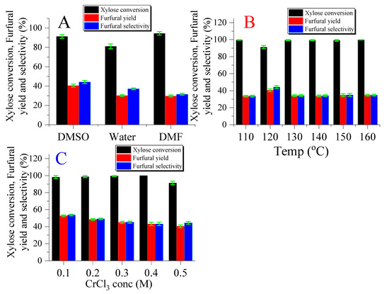Xylose dehydration into furfural. Reaction conditions: (A) 0.5 M xylose, 1.0 M pTSA, and 0.5 M CrCl3·6H2O in 50 mL solvents heated at 120 °C (for water 100 °C), (B) 0.5 M xylose, 1.0 M pTSA and 0.5 M CrCl3·6H2O in 50 mL DMSO heated at different temperatures, (C) 0.5 M xylose, 1.0 M pTSA and different concentrations of CrCl3·6H2O in 50 mL DMSO and 120 °C.