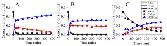 where k1obs, and k2obs, are the reaction rate constants of the conversion of xylose into furfural and xylose decomposition to side products (humin), k3obs is the decomposition rate of furfural to undesired products (humin). Humin (HUM) is the sum of condensation products and quantified using a material balance as defined in Equation (13) [50]. CX, CF, and CHUM denote the molar concentrations of xylose, furfural, and humin, respectively.