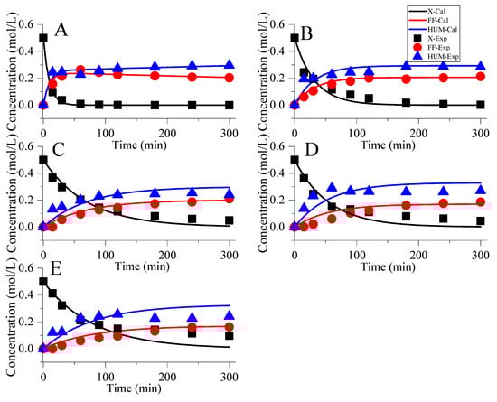 Kinetic plots of dehydration of xylose into furfural. Reaction conditions: 0.5 M xylose, 1.0 M organic acid, and 0.1 M CrCl3·6H2O catalysts in 50 mL DMSO at 120 °C for 5 h; (A) pTSA; (B) Oxalic acid; (C) Succinic acid; (D) Malonic acid; (E) Maleic acid. Lines represent calculated data whereas symbols represent experimental values. X: xylose; FF: furfural; HUM; humin.