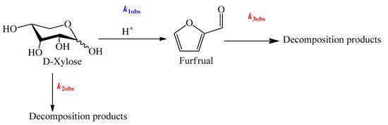 Recently, the kinetics of xylose dehydration have been discussed applying heterogeneous catalysts [25,26] and homogenous catalysts, including mineral acids [27] and organic acids [12]. Although biphasic solvent systems are now widely used, kinetic investigations of xylose dehydration were mostly studied in the aqueous phase at high temperature and high-pressure [28].