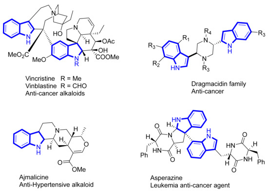 Nitrogen heterocycles (natural and synthetic) are key components of several biochemical, and therefore possess interesting biological properties. Indoles are one such class of organic heterocyclic compounds that occur frequently as a privileged structural motif in many synthetic and natural products with versatile pharmacological activities [1]. In many cases they have widespread uses as cholesterol lowering agents, antiviral, antibacterial, antifungal, and as anticancer compounds [2]. Some of them regulate cellular signaling and numerous neuropsychological processes. The indole structures have a rich history in chemistry beginning with the study of dyes in the mid-19th century. Despite the reported toxicity of some indole-containing compounds, several of them possess clinically beneficial properties. The natural products vinblastine and vincristine, isolated from C. roseus [3], are active against leukemia, lymphoma, breast, lung and other cancers (Figure 1) [4]. Analogues of these compounds are in use for the treatment of a variety of cancers [5]. Numerous other indole-containing compounds have been shown to possess anti-cancer activity, as well as a myriad of other biological properties [6,7,8]. Because of the prevalence of the indole moiety in biologically active compounds, it is considered a “privileged structure” and that makes it a logical motif to improve biological activity of synthetic compounds [9]. The indole moiety is also found in many natural products and comprises a major subset for the alkaloid class of natural products. For example, ajmalicine is an anti-hypertensive alkaloid [10], asperazine has an unusual profile of cytotoxicity [11,12], and dragmacidin exhibits anti-tumor activity against P-388 cell lines with IC50 value of 15 μg/mL, and IC50 of 1–10 μg/mL against MDAMB (human mammary), HCT-8 (human colon) and A-549 (human lung) cancer cell lines [13,14,15].