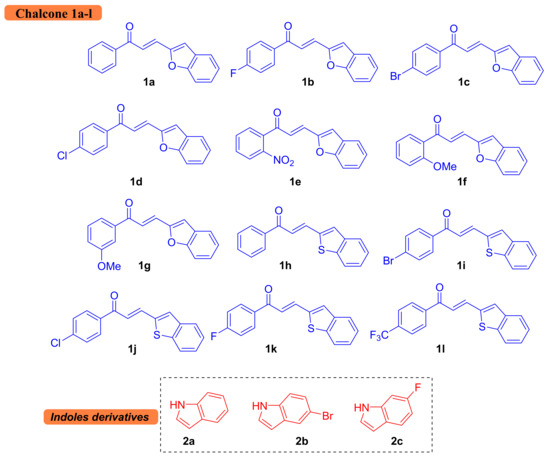 Michaël-type Friedel–Crafts addition of nucleophiles (especially indoles) with electron-deficient alkenes are fundamentally important chemical transformations [20,21,22,23,24]. These methods have extensive uses in the scientific work on a number of potential nucleophilic species. Stabilized carbanions, organometallic reagents, and heteroatom-based nucleophiles have all been applied to a range of Michael acceptors in previous years [20,21]. The desired chalcones 1a–1l in this study were synthesized by following our previous reported method by Barakat et al [23] (Figure 2). Next, the achiral Friedel–Crafts reaction was explored with the chalcones-based benzofuran or thiophene analogues and the substituted indole by employing Fe-Pd bimetallic catalyst system [23] in MeOH at 60 °C to afford the Friedel–Crafts adducts. To check the productivity and the generality of this approach, the reaction of substituted indoles (indole 2a; 5-bromoindole 2b; 6-fluroroindole 2c) and chalcones based benzofuran or thiophene analogues was carried out under the reaction conditions (10 mol% of FeCl3, 10 mol% of PdCl2 and 15 mol% ethyl acetoacetate (EAA), 1.0 equiv. chalcone and 1.1 equiv. substituted indole in CH3OH at 60 °C; Scheme 1). A range of heteroaryl enone substituents further demonstrated a broad substrate scope. Both electron-deficient and electron-rich heterocycles afforded the Friedel–Crafts products in high yield.