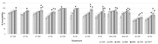 Effect of plant fractions and extracts at 100 µg mL−1 on the immobility of N. aberrans J2s individuals (100–150) after different exposure times.