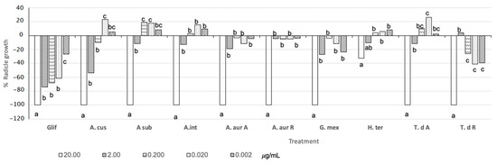 Most nematicidal extracts against N. aberrans extracts showed 100% inhibition (−100%) of L. esculentum radicle growth at 20 µg mL−1, except extracts from H. terenbinthinaceus (−37%) (Figure 4). T. densiflora R extracts were the most phytotoxic with 40 and 38% inhibition at 0.02 µg mL−1 (Figure 4). Potentially, these extracts could act as soil disinfection agents. Also, A. cuspidata, A. subviscida, and T. densiflora A extracts showed hormetic effects: a 20 µg mL−1 solution inhibited radicle growth inhibition while a 0.02 µg mL−1 solution promoted it.