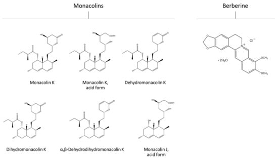 Since hypercholesterolemia is a crucial issue among the Western population, dietary supplements for the treatment of this dysfunction are widely studied and researched. Several products of natural origin have been reported as effective in lowering plasma cholesterol by acting with different mechanisms of action, and in recent years they have been frequently used as the main active ingredients of supplements available in pharmacies as over the counter medicines (OTC) or in regular markets without medical prescription. Among these, the most diffused on the market are the red yeast rice (RYR), characterized by the cholesterol-lowering compound monacolin K (MK), and berberine (BBR), an isoquinolone alkaloid isolated from the root, rhizome or bark of the Chinese herb Coptis chinesis and roots and stems of plants of the genus Berberis [], together with plant phytosterols and policosanols. These extracts/compounds are often used as the sole active ingredients of dietary supplements or are combined with each other in products also containing probiotics, coenzyme Q and vitamins []. MK is a terpenoid whose chemical structure is identical to that of the drug lovastatin (Figure 1). Under acidic conditions, it adopts one of two forms, acidic or lactone, but only the acidic form plays a role in reducing blood lipid concentration []. Such as lovastatin, the mechanism of action behind the lipid-lowering activity of MK involves the competitive inhibition of the enzyme HMG-CoA reductase in the cholesterol synthesis pathway []. Additionally, the side effects associated with MK are similar to those reported for lovastatin, including muscle weakness and pain, hepatitis, and gastrointestinal symptoms such as nausea, vomiting, and diarrhea []. BBR (Figure 1) is a quaternary isoquinolinium salt that belongs to the class of protoberberine alkaloids. It has many chemical forms, such as hydrochloride, sulfate, citrate and phosphate salts []. The mechanism of action behind its cholesterol-lowering activity involves the upregulation of hepatic LDL receptor expression through a post-transcriptional mechanism that stabilizes the LDL-receptor mRNA []. Recent clinical trials show the efficacy of BBR and BBR-containing products in reducing total cholesterol [], and they show scarce incidence of adverse effects, comprising diarrhea, constipation, and abdominal distension [].