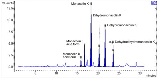 Finally, considering other monacolins than MK, a high variability among the studied products was observed (Table 2). MJA, dihydromonacolin K, and dehydromonacolin K were the most abundant in the products with the highest MK contents (products 7–10), together with MKA in products at lower MK contents (products 1–5).