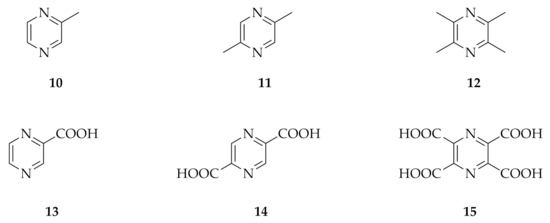 - Klatt, L.N.; Rouseff, R.L. Electrochemical Reduction of Pyrazine in Aqueous Media. J. Am. Chem. Soc. 1972, 94, 7295–7304. [Google Scholar] [CrossRef]