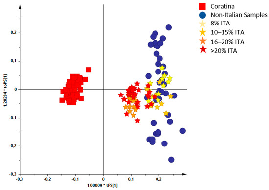 3.4. Supervised Analysis with Coratina and Non-Italian Oils