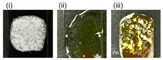In comparison, to the extent that electrical power was used to pre-heat the (BADGE + PA + EM) mixture in advance when using an electric furnace, heating proceeded rapidly from the surface of the adhesive the moment the mixture was placed in the electric furnace. As shown in Figure 2(ii-b), the edge of the adhesive appears to be more cured 30 s after being introduced into the electric furnace. After this time, however, no further changes were observed for the white PA solid, and no PA flowed, contrary to what was observed under microwave heating. After 180 s (Figure 2(ii-g)), the surface seems to have hardened. In reality, however, the resin was not cured and was soft when pressed with a finger.