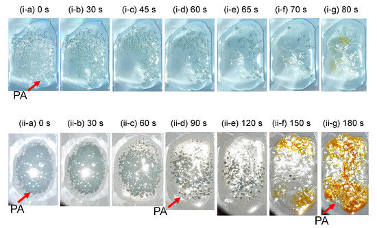 As illustrated from left to right in Figure 2i, the dispersed solid PA began to become transparent about 5 s after the start of microwave irradiation. Approximately one fourth of the PA was not observable from 45 to 60 s (Figure 2(i-c), (i-d)) of microwave irradiation. In fact, after 70 s, much of the PAs disappeared (Figure 2(i-f)), and after 80 s, the curing was complete (Figure 2(i-g)). The disappearance of PA, which appears white initially, progresses as the curing reaction evolves. Observing these series of recordings, we noted that the heating of the adhesive never occurred from the edge. In other words, heating appeared to proceed relatively evenly. It should be noted that in microwave irradiation in the single mode, the heating proceeds in a shorter time than in the multimode because in the former, the microwaves irradiate the adhesive more efficiently.