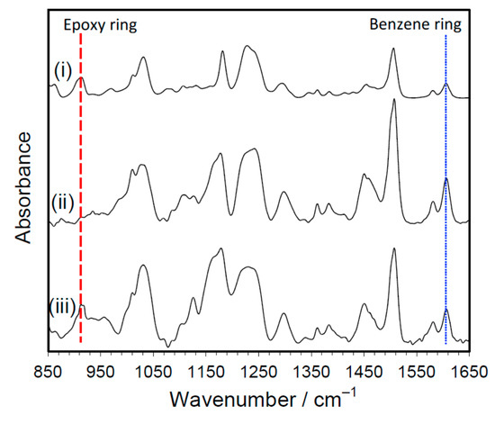 The quality of the cured (BADGE + PA + EM) adhesive by microwave heating and electric furnace heating was examined by attenuated total reflectance FT-IR spectroscopy. Note that the sample used in the FT-IR analysis was the cured adhesive sample obtained in Figure 1. The intensity of the peak at 913 cm−1 (dashed red vertical line in Figure 3), attributed to the epoxy ring of BADGE [12,13,14,15,16], decreased with microwave curing. In contrast, the intensity of the peak at 1605 cm−1 (dotted blue vertical line in Figure 3) derived from the benzene ring present in BADGE [16] showed relatively no changes. No IR peak of the epoxy ring was seen in the cured (BADGE + PA + EM) adhesive subsequent to microwave heating for 10 min, which confirmed the occurrence of complete crosslinking of BADGE (Figure 3i) [12,13,14,15,16]. On the other hand, the peak of the epoxy ring was still visible after a 20 min curing period by electric furnace heating (Figure 3iii), indicating incomplete curing. Clearly, the curing process was uneven when comparing the two curing methods.