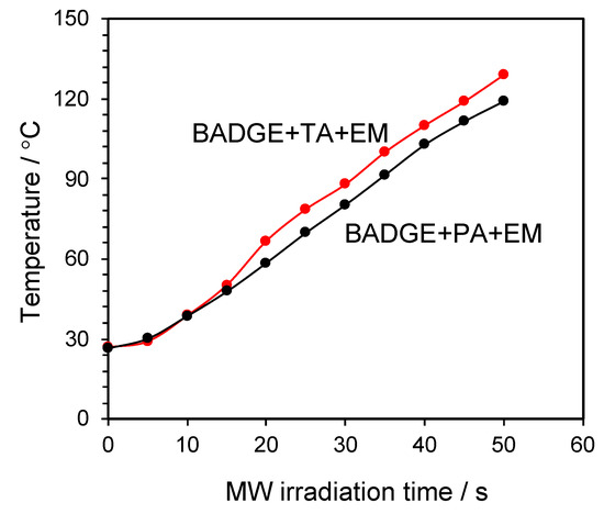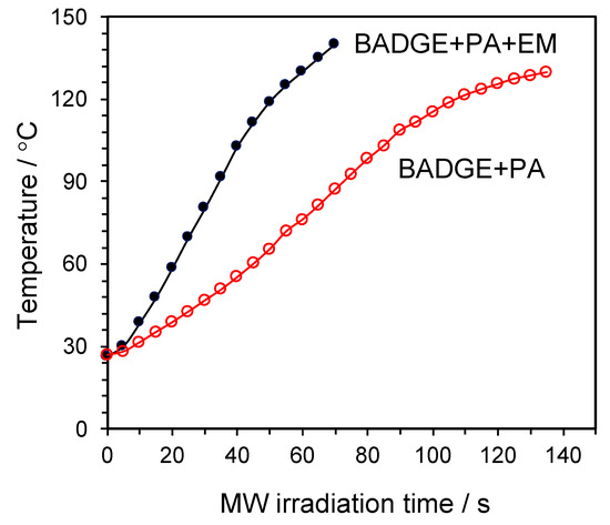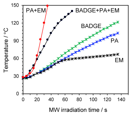Significant enhancement of temperature rise proceeded with initial irradiation with microwaves. Therefore, it seems that microwave heating promotes the chemical reaction between the curing agent and the plasticizer. To further separate the factors that influence the heating rate, the mixture of PA and EM ((PA + EM) in Figure 4) was microwave-heated, which led the heating efficiency to further improve after 20 s. The temperature reached 140 °C after about 74 s for the three-component mixture. Additionally, the mixture (PA + EM) displayed a higher microwave heating rate than did the (BADGE + PA+ EM) mixture. Moreover, the heating rate was more than 3 times better than those of PA or EM alone.