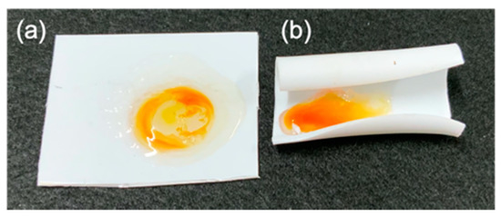 From the curing sample data of Table 2, it is expected that the cured adhesive will hardly generate heat from the microwaves. This feature of heating may protect against deterioration of the substrate, which is a disadvantage of thermosetting adhesives. A cured sample data in Table 2 shows that even if the cured adhesive were continuously irradiated with microwaves, further heat generation could be prevented, and the base substrate would not be exposed to heat for a long time, so that deterioration can be suppressed. Therefore, to substantiate this hypothesis, demonstration of curing was conducted by placing a sample of the (BADGE + PA + EM) adhesive onto two polystyrene plates, which were subsequently heated either by the microwaves or else in the electric furnace. Note that polystyrene, which has low microwave heat generation efficiency, was used as the base substrate. The microwave device used in this experiment was the commercially available Milestone multimode system. The curing of the (BADGE + PA + EM) adhesive was complete after about 6 min of microwave irradiation. The continued heating for 20 min led only to a slight temperature increase of the polystyrene plate (Figure 7a). On the other hand, when the polystyrene plate was heated in an electric furnace, it began to deform within about 5 min with continued heating, causing the plate to deform completely (Figure 7b). Clearly, unlike curing by electric furnace heating for 20 min that caused significant thermal deterioration of the base material, microwave curing was rapid, gave a high-quality product, and was selective as microwave heating affected only the adhesive mixture. The same experiment was conducted in the single-mode system (see Section 3.3); again, no distortion of the polystyrene plate was observed.