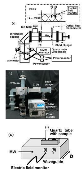 where λ is the wavelength in the waveguide, λ0 (2.45 GHz) = 12.24 cm is the wavelength in vacuum given by c/f (with c being the speed of light, 2.9979 × 1010 cm s−1, and f being the microwave frequency 2.45 × 109 s−1, i.e., 2.45 GHz), and b is the width of the waveguide, 10.92 cm (Figure 8c). The maximal position of the E-field from the iris was at 1/2 the wavelength of the standing wave in the waveguide, namely 7.39 cm. The maximal position of the H-field from the iris was located at ¾ of the wavelength of the standing wave in the waveguide, namely 11.09 cm [22]. An electric field monitor with a probe (Fuji Electronic Industrial Co., Ltd., Tsurugashima, Japan, J-213 E-monitor) was used to maintain the sample at the maximal position of the E-field density, as the reproducibility of such experiments is often diminished if such operations are neglected. The density was measured from a 2 mm hole (I) on the side of the waveguide (Figure 8c). On the other hand, if the electric field at hole (II) were near zero, then the magnetic field would be at its maximum. Note that the reflected power determined experimentally was less than 0.1 W.