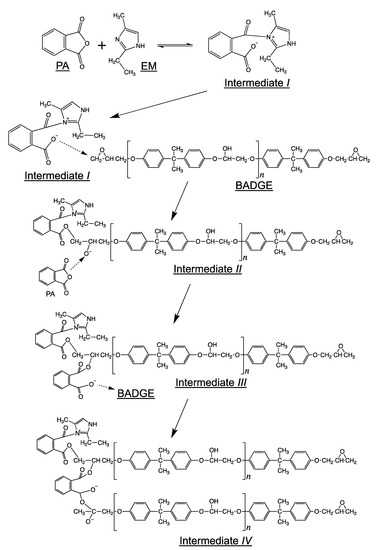 Initially, the curing agent (PA) reacts with the curing accelerator (EM) at low temperature to form the charged intermediate I, subsequent to which the C–O− group attacks the epoxy ring of BADGE to form intermediate II. Another PA attack on the C–O− group of intermediate II produces intermediate III, subsequent to which addition of another BADGE to the C–O− group of intermediate III repeatedly leads to additional crosslinking to yield intermediate IV and ultimately to the curing of the adhesive.