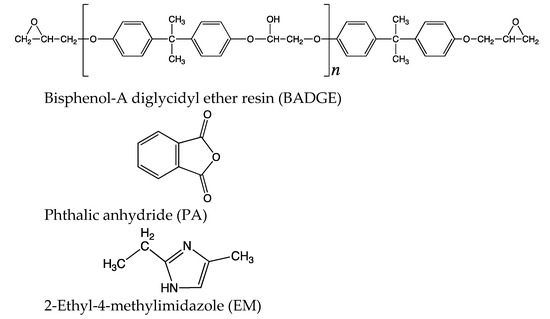 The colorless viscous bisphenol-A diglycidyl ether (BADGE; JER827, Mitsubishi Chemical Co., Tokyo, Japan) was the epoxy resin, the white solid phthalic anhydride (PA; C8H4O3; Tokyo Chemical Industry Co., Ltd., Tokyo, Japan) was the curing agent, while the 2-ethyl-4-methylimidazole liquid (EM; C6H10N2; Tokyo Chemical Industry Co., Ltd.) was the curing accelerator (see Scheme 2).