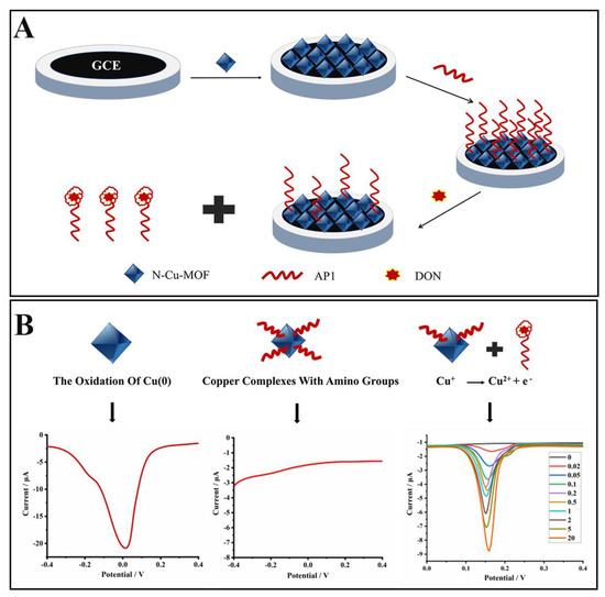 Schematic illustration of the electrochemical aptasensor based on the N–doped Cu–metallic organic framework (N–Cu–MOF) for selective detection of deoxynivalenol (DON). (A) Preparation of the aptasensor. (B) Mechanisms of the sensing system.