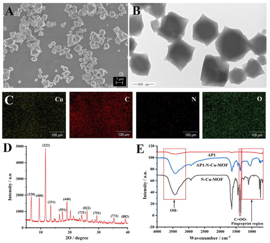 (A) Scanning electron microscopy image (SEM), (B) transmission electron microscopy image (TEM), (C) elemental mapping and (D) X-ray diffraction patterns (XRD) of N–Cu–MOF; (E) Fourier-transform infrared spectroscopy (FT-IR) spectra of N–Cu–MOF, aptamer (AP1) and AP1–N–Cu–MOF.