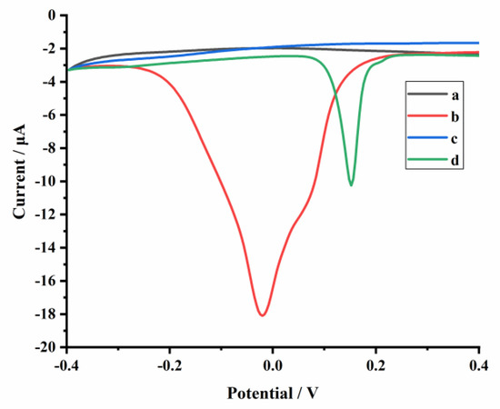 The electrochemical behaviors of the aptasensor were investigated in PBS (1 mmol L−1, pH 5.0). As shown in Figure 3, compared to a bare glassy carbon electrode (GCE) (curve a), an obvious peak appeared at around −0.02 V when the GCE was modified with N–Cu–MOF nanoparticles (curve b), which was ascribed to the electrochemical oxidation of Cu (0) [31,32]. The electrical signal of N–Cu–MOF disappeared when the electrode was further assembled with aptamer (AP1) due to the complexation of amino groups (-NH2) in AP1 with copper. After incubation of the AP1-grafted N–Cu–MOF/GCE into DON solution (10 ng mL–1), a new oxidation peak at about 0.15 V appeared (curve d), implying the restoration of electrochemical activity of copper-based nanomaterial after the removal of AP1 from the N–Cu–MOF-modified electrode. The peak from 0.15 V belonged to the oxidation of Cu+: Cu+ →Cu2+ + e−, which is consistent with the previous publications [33]. The anodic peak may be related to the change of the valence state of Cu. The peak current at 0.15 V increased as the amount of the aptamer located on the electrode decreased, which was attributed to the nonconductive aptamer increasingly blocking the electron transfer by N–Cu–MOF. When detecting DON, aptamers were removed from N–Cu–MOF; thus, the signal appeared and was proportional to the concentration of DON.