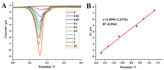 Under the optimal experimental conditions, the current responses increased gradually with the increase in DON level (Figure 4A). Furthermore, a good linear relationship was obtained between the change of the oxidation peak currents (ΔI) and the logarithm of DON concentrations in the range of 0.02–20 ng mL−1 (Figure 4B). The linear regression equation was ΔI (μA) = 4.4996 + 2.2376 lgCDON (ng mL−1), with a correlation coefficient (R2) of 0.9941, and the detection limit was 0.008 ng mL−1 (S/N = 3).