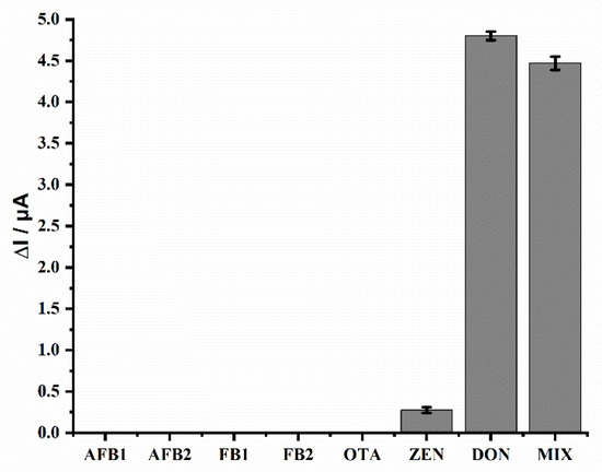 Selectivity of the electrochemical aptasensor in the detection of DON. The concentration was 2 ng mL−1 for all mycotoxins. MIX represents a mixture of multiple mycotoxins: AFB1+ AFB2+ FB1+ FB2+ OTA+ ZEN+ DON.
