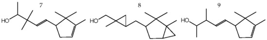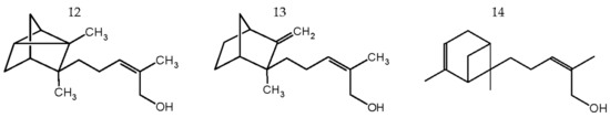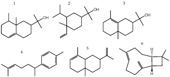 | Sesquiterpene alcohols C15H26O | 55.2 | 53.8 | 39.9 | 49.1 | 1.1 | 0.0 |