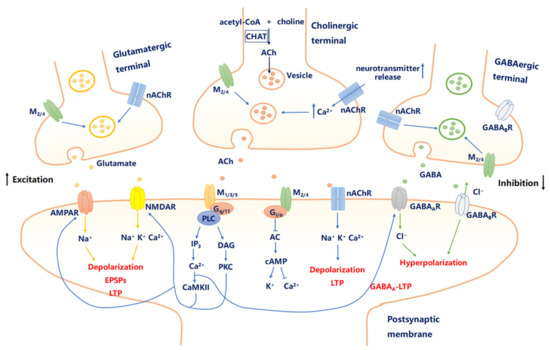 Cholinergic signaling modulates “excitation–inhibition” balance in the brain. Presynaptic or postsynaptic muscarinic acetylcholine receptors (mAChRs) and nicotinic acetylcholine receptors (nAChRs) influence synaptic plasticity by increasing intracellular Ca2+ release, induction of long-term potentiation (LTP), and leading to a depolarization. Additionally, the excitation of presynaptic nAChRs increases the release of many neurotransmitters including dopamine, norepinephrine, γ-aminobutyric acid (GABA), and glutamate (Glu) in a Ca2+-dependent manner.