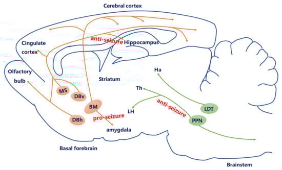 Currently, studies of clinical and experimental models of epilepsy suggest a more precise conceptual mechanism that seems to underlie epilepsy: a change in the excitation–inhibition (E-I) balance in circuit-level dysfunction. Therefore, exploring and understanding the precise circuit-level cholinergic mechanism of epileptic seizures is essential for precise circuit therapy and regulation. The question arises as to how cholinergic neurons modulate the circuit-level dysfunction of an epileptic seizure. Epilepsy originates from the limbic system, especially from amygdaloid and hippocampal regions. Numerous studies have attempted to explain how the BF cholinergic system projects to the cortex [63], hippocampus, and amygdala [64,65], which are critical regions for the seizure generation and spread (Figure 2). For example, the changes in the amygdaloidal cholinergic connections from the BF may contribute to epilepsy-related hyperexcitability [50]. Nicotine elicits convulsive seizures by activating amygdala neurons mainly via α7 nACh receptors. Intracerebrally, physostigmine, a reversible cholinergic medication, in limbic structures has been reported to prolong seizure by increased sensitivity to kindling stimulations [66]. However, intraventricular administration of 192 Immunoglobulin G -saporin, which inhibits cholinergic projection to the hippocampus and cortex respectively, facilitates seizure induced by amygdala kindling [67]. These data suggested that cholinergic neurons may play a critical but heterogeneous role in epilepsy at the circuit level.