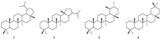 Terpenes can be formally divided into smaller subclasses based on the number of carbons. Triterpenes are the subclass that contains 30 carbons in its structures. This subclass is composed of a large number of compounds that may be divided according to their basic skeletons into several structural families. The most important families of triterpenes are derivatives of protostane, cycloartane, dammarane, and euphane, and pentacyclic derivatives, such as oleanane, ursane, gammacerane, lupane, and hopane. Figure 1 shows the structures of selected main skeletons of pentacyclic triterpenes—lupane (1), hopane (2), ursane (3), and oleanane (4) [17,18].