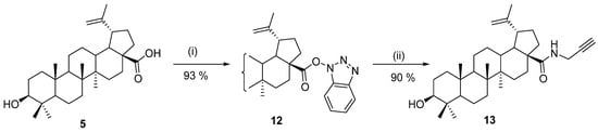 Preparation of a propargylamide derivative of betulinic acid [67]. Reagents and conditions: (i) TBTU, DIPEA, THF; (ii) propargylamine, K2CO3, and DMF, 1 h.