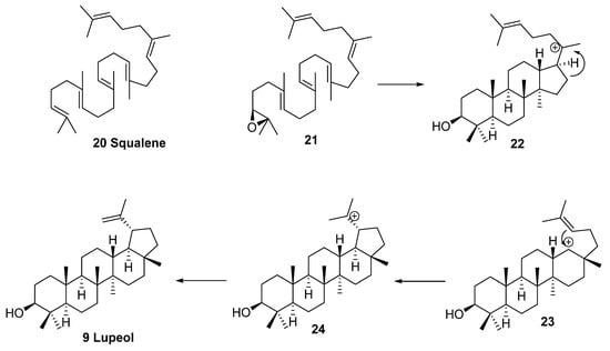 Enzymatic synthesis of cyclic triterpenes, including lupeol (9), which is an intermediate for the biosynthesis of betulin (8) and betulinic acid (5), was reviewed in detail by Abe in 2007 [86]. The biosynthesis of lupeol (9) starts from (3S)-2,3-oxidosqualene (21). First, the cyclization of (3S)-2,3-oxidosqualene is initiated by protonization and produces the 6.6.6.5-fused tetracyclic dammarenyl C-20 cation 22. Next, D-ring expansion occurs, producing cation 23, from which lupanyl tertiary cation 24 is generated, and this charged species then eliminates protons from one of the terminal methyl groups to give lupeol (9) (Scheme 6) [86].