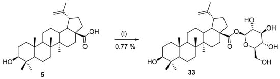 Selected chemical methodologies for amidation, esterification, and hydrolysis have already been mentioned in the previous section. This section contains information about chemoenzymatic modification of derivatives of betulinic acid (5), betulin (8), and lupeol (9). In 1999, Chatterjee et al. [123] investigated the metabolic biotransformation of betulinic acid (5) in a selected fungal model system (Cunninghamella species NRRL 5695). This investigation led to the discovery of the conjugate 28-O-β-d-glucopyranosyl 3β-hydroxy-lup-20(29)-en-28-oate (33) (Scheme 7). Thirteen other fungal cultures were also tested by the authors for the preparation of the same compound, but only Cunninghamella species NRRL 5695 exhibited the ability to produce the exact glucopyranosyl ester 33. Biological evaluation of its cytotoxic activity against several human melanoma cell lines showed no interesting activity in comparison with betulinic acid (5) [123].