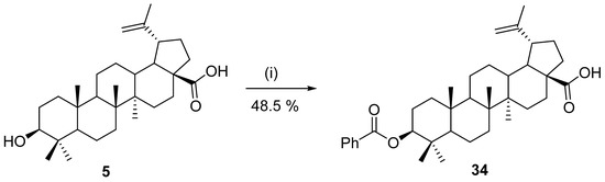 In 2008, Yasin et al. published work in which response surface methodology was used to determine the optimal conditions for enzymatic synthesis of betulinic acid benzoyl ester 34. Novoenzym 435, benzoyl chloride, and betulinic acid (5) were used as model components for their study. The experimental yield was 48.5% under the optimal conditions (Scheme 8) [124].