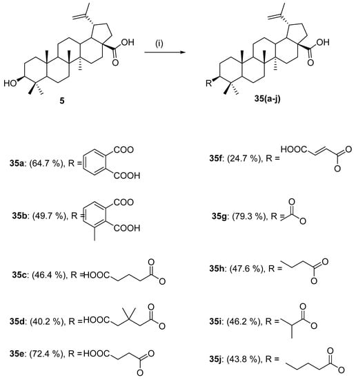 In the same year, Ahmad et al. also published an article dealing with the preparation of 3-O-acylated betulinic acid derivatives 35a–35j catalyzed by Novoenzym 435. Appropriate anhydrides were used as acylating reagents (Scheme 10). The anticancer activity of these derivatives was also evaluated in this study in vitro against human lung carcinoma (A549) and human ovarian (CAOV3) cancer cell lines. The most promising results were shown by 3-O-glutarylbetulinic acid 35j, 3-O-acetyl-betulinic acid 35g, and 3-O-succinyl-betulinic acid 35e against the A549 cancer cell line (IC50 < 10 μg/mL). Both derivatives had better cytotoxic activity than betulinic acid (5) [126].