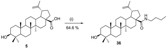 In 2012, Mao et al. [127] reported the biotransformation of betulin (8) by the yeast strain Rhodotorula mucilaginosa. This yeast converted 52.65% of the added 4 mg/mL betulin to betulone and 11,14-octadecadienoic acid methyl ester under optimal conditions (initial pH 6.0, 20 °C for 1 d). In 2016, Yusof et al. optimized the conditions for the enzymatic synthesis of betulinic acid amide 36. Novoenzym 435 from Candida antartica was used as a catalyst for enzymatic amidation, and butylamine was used as an amine reagent that was coupled with betulinic acid (5). Using the optimal conditions gave the product in 64.6% yield (Scheme 11) [128].
