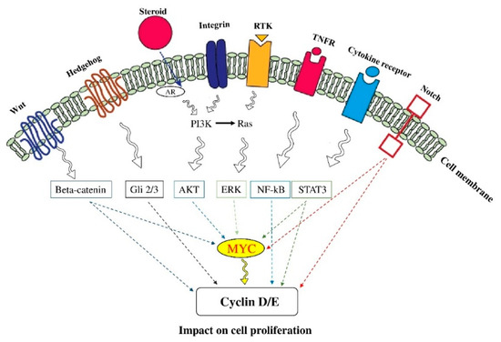 The activation of the PI3K/Akt/mechanistic target rapamycin complex I (mTORC1) pathway can regulate cell growth [37]. The Akt phosphorylates glycogen synthase kinase 3 (GSK3), cyclin D, and Myc and inhibits catalytic activity [38,39]. Moreover, Akt inactivates several cell cycle inhibitors, such as p21 (CIP1) and cyclin-dependent kinase inhibitor p27 (KIP1); however, the phosphorylated Akt can lead to 14-3-3 proteins sequestration in the cytoplasm [40]. Moreover, the Akt can inhibit the transcription factors of the forkhead box (FoxO), e.g., retinoblastoma-like protein 2 (RBL2) and p27, which can stimulate the phosphorylation of the mouse double minute 2 homolog (MDM2) and ubiquitin ligase to degrade p53 [41,42]. The Akt can also control multiple enzymes involved in the G2/M transformation of the cell cycle [43]. Besides, Akt can phosphorylate β-catenin, which results in its separation from cadherin cellular adhesion complexes and the promotion of β-catenin transcriptional activity [44]. As mentioned above, signaling pathways are the cornerstone of cell proliferation in cancers. Since cytokines and the RTK signaling can activate the signal transducer and activator of transcription 3 (STAT3) and NF-κB, they can activate the expression of Myc and cyclin D [45].