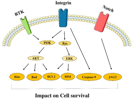 Cell death serves as a homeostatic mechanism; however, mutations can dysregulate cell death signals in various cancers. For instance, the Notch signaling can stimulate cell survival by interacting between Jagged-2 (JAG2) ligand and receptor Notch2 in multiple cancers [48]. Moreover, studies have indicated that the Ras-ERK and PI3K-Akt pathways can control cell death in many malignancies [49]. The Akt also can interfere with the apoptotic signaling of death receptors. It inhibits pro-apoptotic B cell lymphoma 2 (Bcl2)-family member Bim and death ligands, e.g., Fas ligand (FasL) and TRAIL. Moreover, the Akt stimulates the X-linked inhibitor-of-apoptosis protein apoptosis inhibitor (XIAP) [50]. Furthermore, the Akt activates the NF-κB pathway, which regulates anti-apoptotic enzymes, i.e., Bcl2, BCLxl, and Mcl1 [50]. Moreover, the Akt can repress the p53-induced apoptosis via the degradation of p53 [41]. Bim, a pro-apoptotic BH3 member of the Bcl-2 family, can be regulated by MEK/ERK-mediated phosphorylation, which affects its binding to Bcl-2 family members and its turnover [51] (Figure 2). Besides, recent findings have indicated that c-Jun N-terminal protein kinases (JNKs), as the members of the MAPK family, can regulate tumor proliferation. However, JNK1 and JNK2 have opposing functions in pancreatic cancer cells. The inhibition of JNK2 has been associated with increased tumor proliferation of pancreatic cancer cells [52]. It has also been reported that JNK2 can protect p53 from MDM2-induced degradation, and the downregulation of JNK2 has been associated with the inferior prognosis of patients with bladder cancer who underwent cystectomy [53]. Therefore, the activation of JNK2 might be associated with the suppression of tumoral cells in pancreatic and bladder cancers.