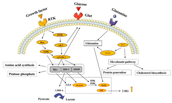 Metabolism dysregulation, e.g., the mutations of IDH1 and IDH2, can increase metabolites in cancer cells [54]. The inhibition of tumor suppressor genes and activation of oncogenes can dysregulate the metabolic pathways. For instance, the PI3K-Akt pathway can reprogram the metabolism [55]. The Akt regulates the transport of glucose, which can promote glycolysis [56]. Indeed, the Akt2 regulates the transcription, accumulation, and traffic of glucose transporter 1 (GLUT1) [57,58,59]. In line with these, it has been reported that the activation of Akt can substantially stimulate glycolysis in tumoral cells [60].