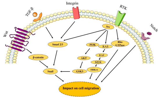 Signaling pathway and cell migration. Metastasis is a multistep process that includes migration and invasion of cancer cells. Migration is regulated by adhesion receptors, chemokines, growth factors, and other stimulators. The figure was produced using Servier Medical Art (http://smart.servier.com/) (assessed on 2 January 2020).